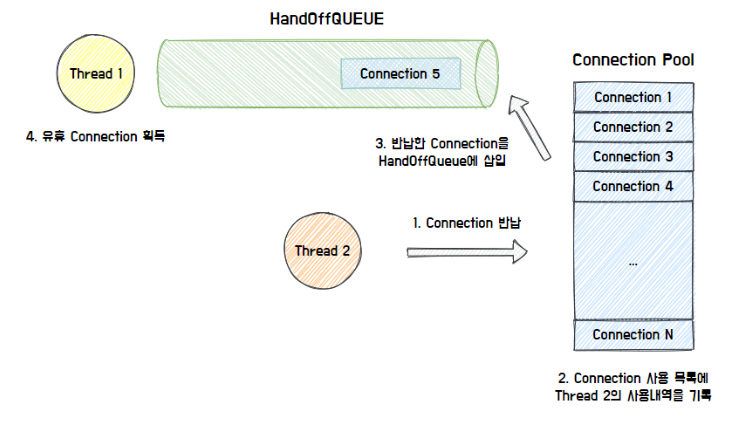 - 사용자는 Connection을 반납하면 Connection Pool이 사용내역을 기록하고 HandOffQueue에 반납된 Connection을 삽입함