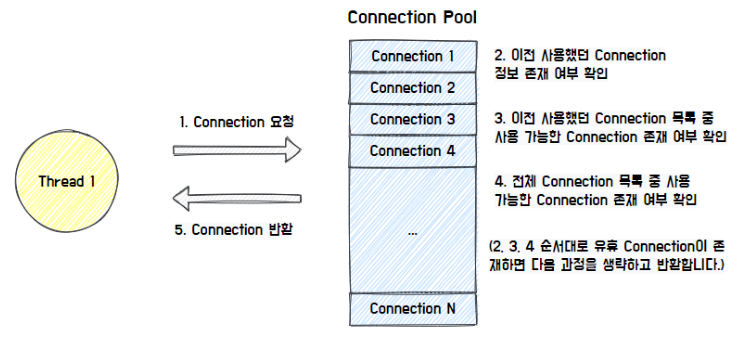 이러한 동작으로 쓰레드들은 커넥션을 획득,반납함으로써 상대적으로 비싼 비용이 드는 커넥션 생성을 줄일 수 있습니다.