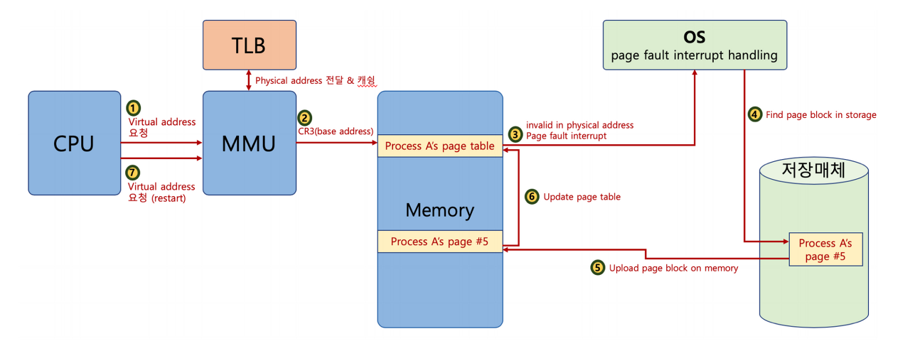 운영체제가 페이지 폴트가 일어나면, 해당 페이지를 물리 메모리에 올린다.